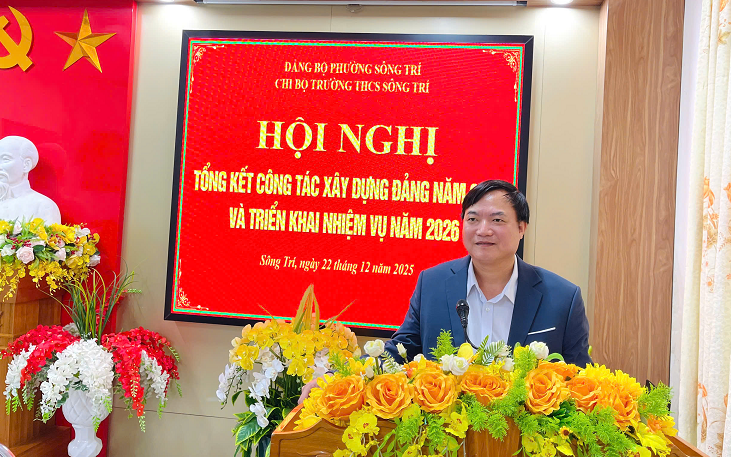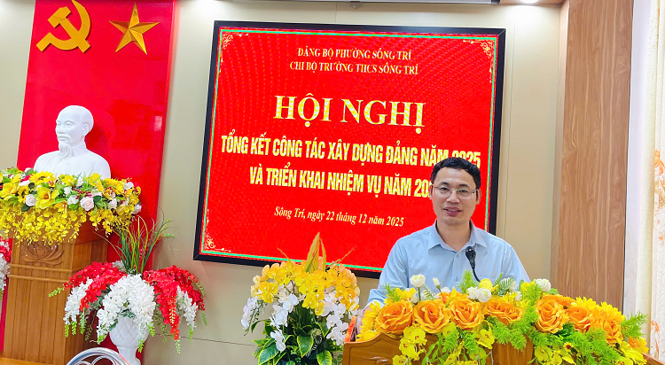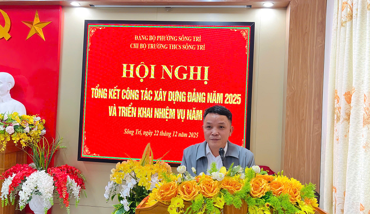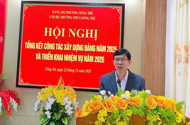 Đồng chí Đinh Văn Báu – Phó Bí thư chi bộ, Phó Hiệu trưởng thông qua báo cáo kết quả thực hiện nhiệm vụ năm 2025 và phương hướng, nhiệm vụ, giải pháp trọng tâm năm 2026