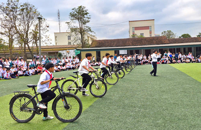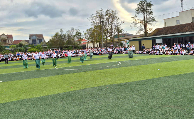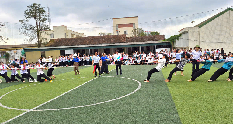Bên cạnh đó, ngày hội diễn ra sôi nổi với các trò chơi vận động như kéo co, nhảy bao bố, đi xe đạp chậm… thu hút đông đảo học sinh tham gia, cổ vũ nhiệt tình. Các hoạt động không chỉ tạo sân chơi lành mạnh, bổ ích mà còn góp phần rèn luyện thể chất, tinh thần đoàn kết, ý thức tập thể cho học sinh.