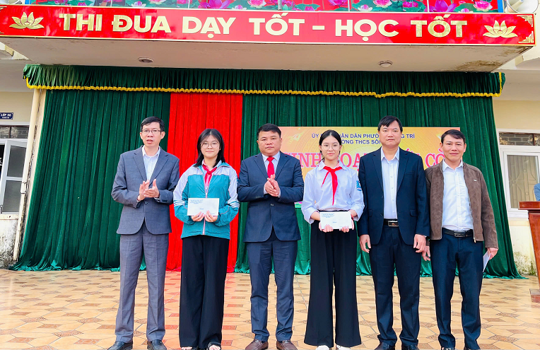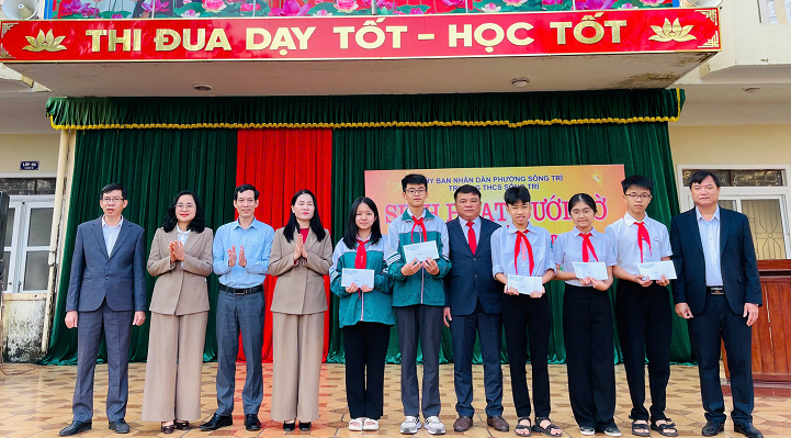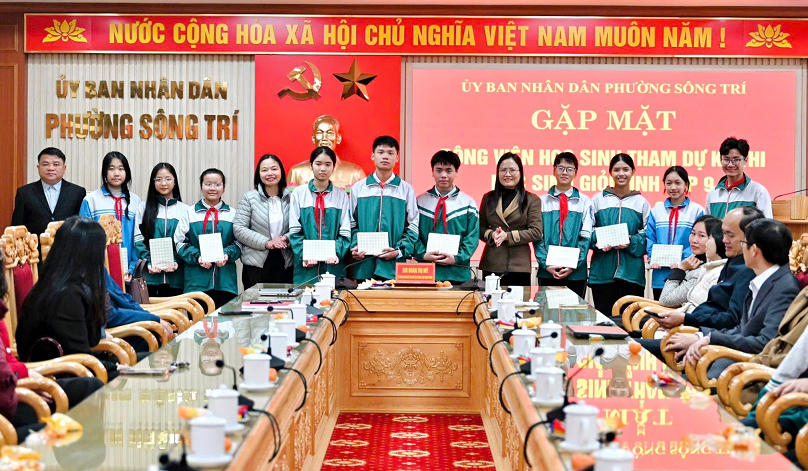 Đồng chí Đoàn Thị Mỹ - Uỷ viên Ban Thường vụ Đảng uỷ, Phó Chủ tịch UBND phường Sông Trí, cùng lãnh đạo Phòng Văn hoá-Xã hội phường, Ban giám hiệu các trường THCS tặng quà, chúc mừng các đội tuyển học sinh giỏi tỉnh lớp 9 toàn phường trước kỳ thi