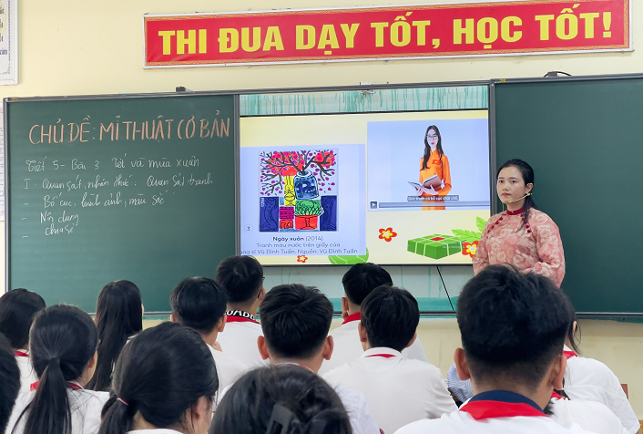 Với môn Mỹ thuật, lớp 9D học bài “Tết và mùa xuân” - một tiết học đầy màu sắc và cảm xúc. Dưới sự dẫn dắt của giáo viên, học sinh thỏa sức sáng tạo trong việc thể hiện sắc xuân qua tranh vẽ. Những bức tranh ngập tràn màu sắc rực rỡ, chứa đựng niềm vui, ước vọng và tình yêu quê hương, thể hiện khả năng thẩm mỹ và cảm xúc nghệ thuật phong phú của học sinh.